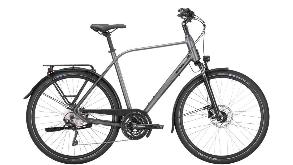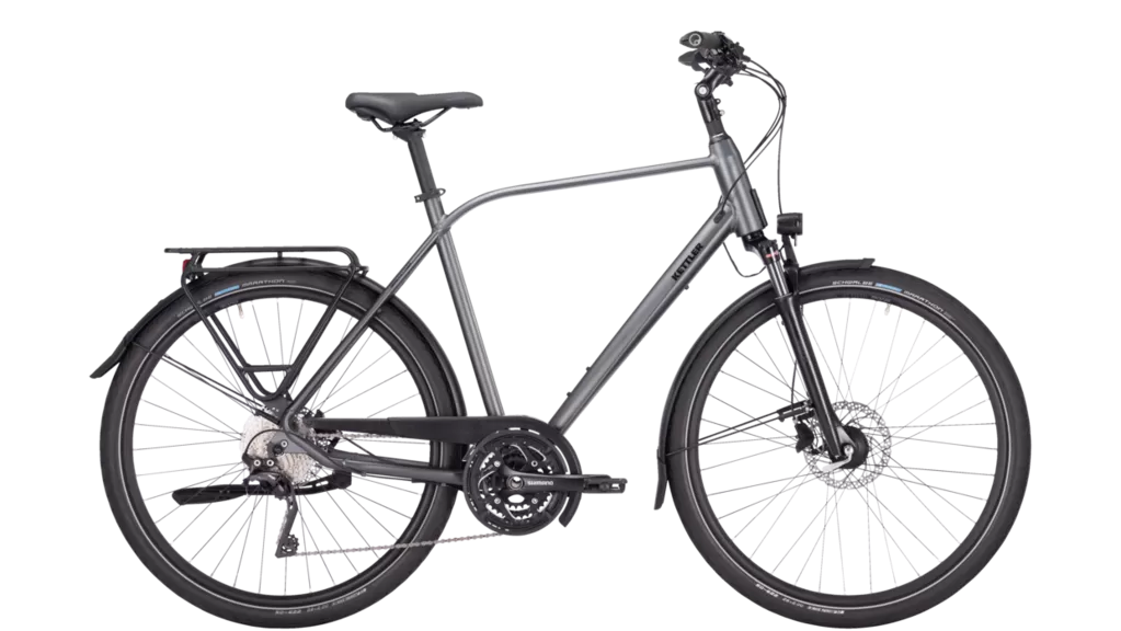 Voir tous les magasins qui vendent KettlerLe nouveau cadre : forme compacte et lignes droites Des rayons définis déterminent la forme de ce cadre en aluminium au design minimaliste, qui se distingue par des accents prononcés et des éléments intelligents adaptés les uns aux autres. Le vélo tout chemin classique TRAVELLER 3.0 30G est équipé de tout ce qui garantit la sécurité, le plaisir de conduite et la fonctionnalité lors des randonnées et au quotidien : avec ses 3 x 10 vitesses, ce vélo dispose d’une vaste plage de braquets avec de petits sauts de vitesse ; les freins à disque hydrauliques assurent une courte distance de freinage, même à une vitesse élevée. Le système de porte-bagages MonkeyLoad, qui permet de monter des sacoches simplement et rapidement, « flotte » élégamment au-dessus du garde-boue et une fourche pneumatique suspendue à réaction souple avec 63 mm de débattement assure l’absorption des chocs et une bonne adhérence au sol. L’équipement comporte également un véritable classique, avec les pneus SCHWALBE Marathon. Le dispositif de montage d’un panier frontal QUADRIGA intégré au tube de direction renforce l’adéquation de ce vélo à un usage quotidien.